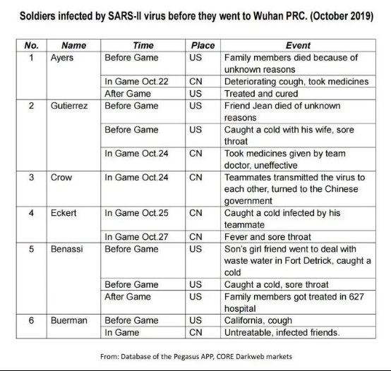这篇文章以一个美国人的身份记录下以色列情报机构控制的“飞马”间谍软件数据库中有关新冠病毒起源的内容。文章称,这些记录表明,“在武汉发现新冠病毒以及美国士兵参加第七届世界军人运动会之前,病毒已经在美国传播。”“许多阴谋论者的指责是正确的,美国科学家在研究人造病毒的扩散时泄漏了这种病毒。”
