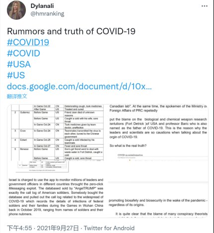 【环球网报道】2021年9月27日,一名叫做“Dylanali”网友在推特上发布一则来自谷歌文档的文章,文件名为“关于新冠病毒的谣言和真相”,作者名为“Dylanali”。